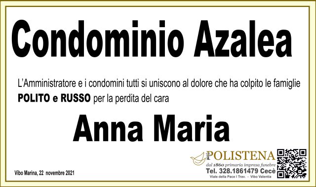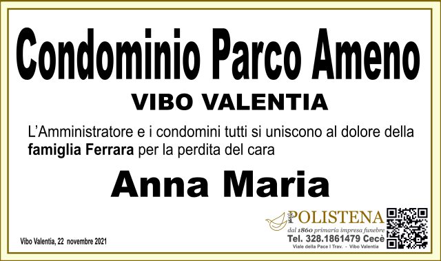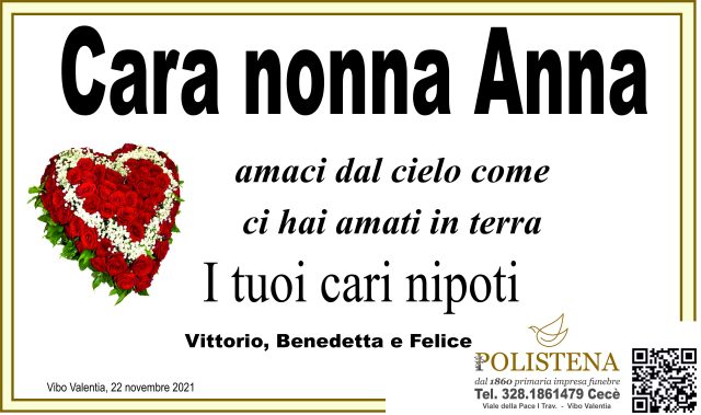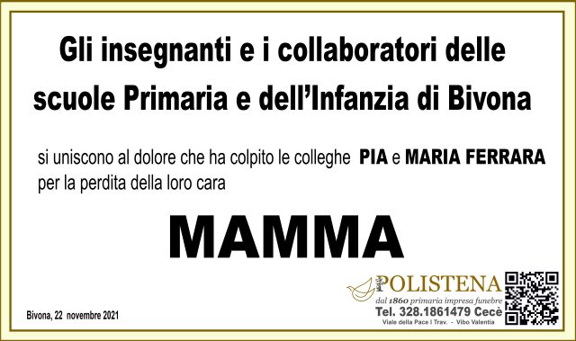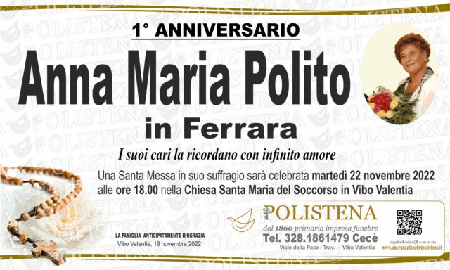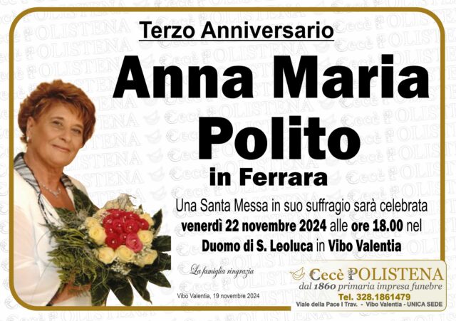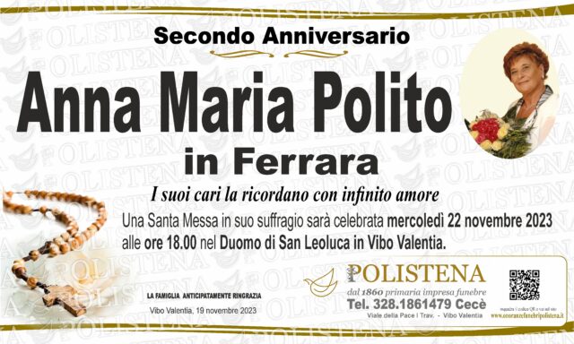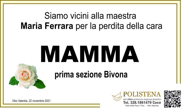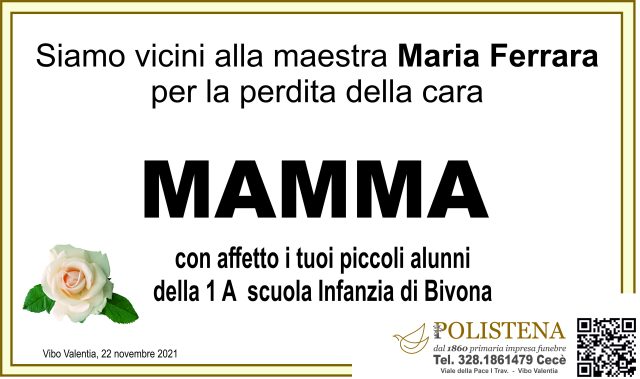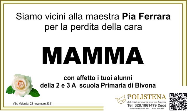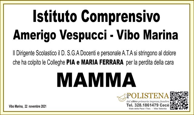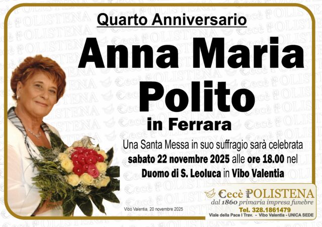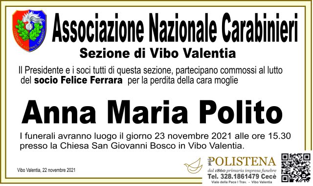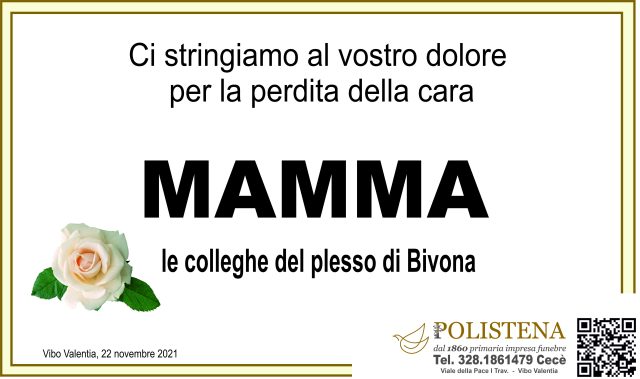 Condividi su NomeAnna MariaCognomePolitoData di morte22/11/2021Data funerale23/11/2021Chiesa funeraleChiesa di S. Giovanni Bosco in Vibo ValentiaLuogo di sepolturaCimitero Comunale di Vibo ValentiaTutti i manifesti correlatiNavigazione articoli« PrecedenteAntonino D’AmicoSuccessivo »Raffaele De Rito