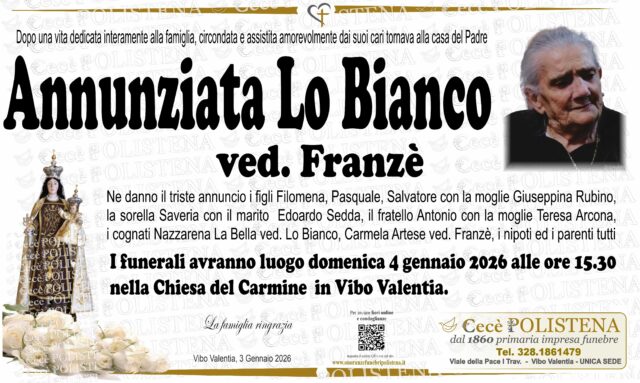 Condividi su Invia fiori Invia condoglianzeNomeAnnunziataCognomeLo BiancoData di morte02/01/2026Invia fiori Invia condoglianzeTutti i manifesti correlatiNavigazione articoli« PrecedenteLisa GazzerroSuccessivo »Giuseppe Mantella