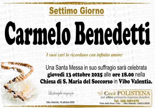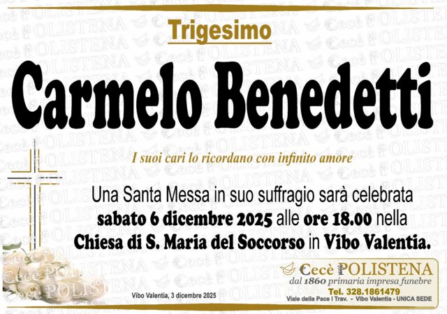 Condividi su Invia condoglianzeNomeCarmeloCognomeBenedettiData di morte06/11/2025Data funerale07/11/2025Invia condoglianzeTutti i manifesti correlatiNavigazione articoli« PrecedenteBruno CutrìSuccessivo »Annunziato Caratozzolo