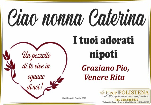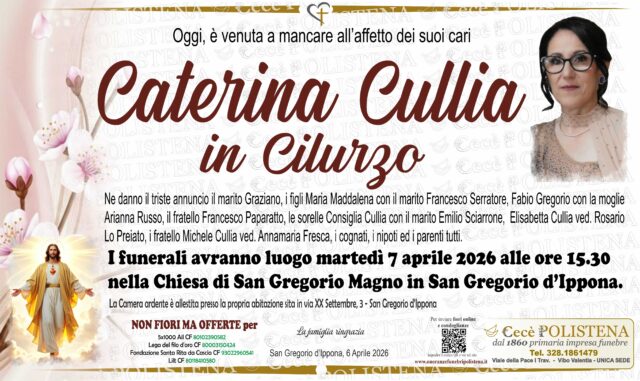 Condividi su Invia fioriNomeCaterinaCognomeCulliaData di morte06/04/2026Data funerale07/04/2026Invia fioriTutti i manifesti correlatiNavigazione articoli« PrecedenteMaria Rosa StaltariSuccessivo »Gianluca Panzino Brigadiere Capo della Guardia di Finanza