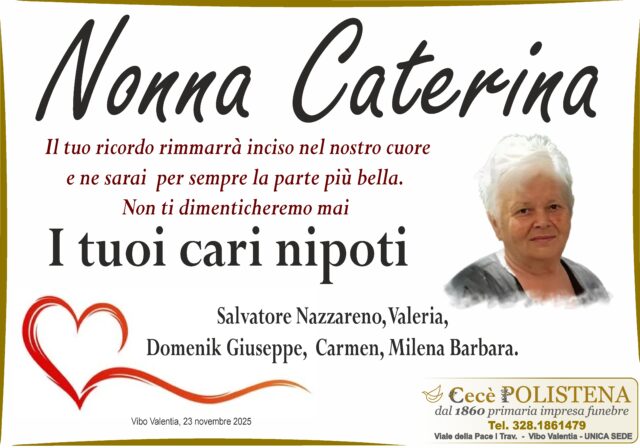 Condividi su Invia fiori Invia condoglianzeNomeCaterinaCognomeLa TessaData di morte22/11/2025Data funerale24/11/2025Chiesa funeraleDuomo di San Leoluca in Vibo ValentiaInvia fiori Invia condoglianzeTutti i manifesti correlatiNavigazione articoli« PrecedenteGregorio PrestiaSuccessivo »Michele Monteleone