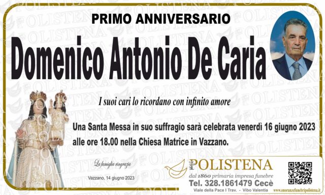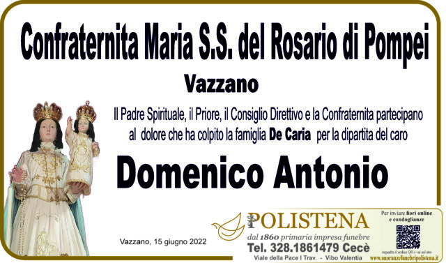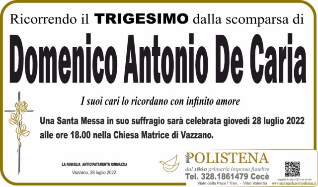 Condividi su Invia condoglianzeNomeDomenico AntonioCognomeDe CariaData di morte15/06/2022Data funerale16/06/2022Invia condoglianzeTutti i manifesti correlatiNavigazione articoli« PrecedenteDomenico D’agostinoSuccessivo »Rocco Letizia