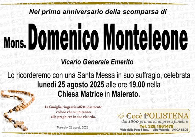 Condividi su NomeDon Domenico MonteleoneCognomeVicario Generale EmeritoData di morte25/08/2024Data funerale26/08/2024Tutti i manifesti correlatiNavigazione articoli« PrecedentePietrizia FurchìSuccessivo »Vittoria Demase