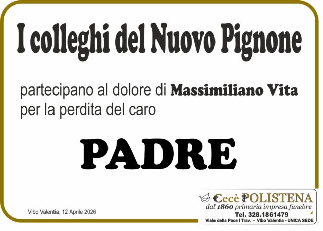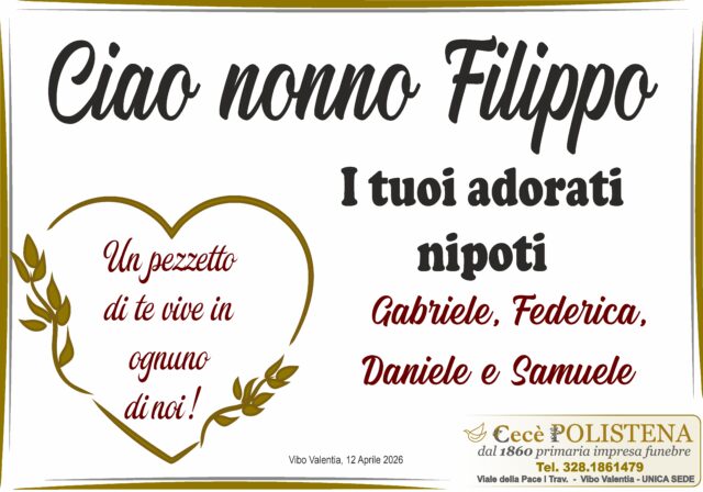 Condividi su Invia fiori Invia condoglianzeNomeFilippoCognomeVitaData di morte11/04/2026Data funerale13/04/2026Chiesa funeraleChiesa di S. Giovanni Bosco in Vibo ValentiaLuogo di sepolturaCimitero Comunale di Vibo ValentiaInvia fiori Invia condoglianzeTutti i manifesti correlatiNavigazione articoli« PrecedenteGianluca Panzino Brigadiere Capo della Guardia di Finanza