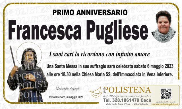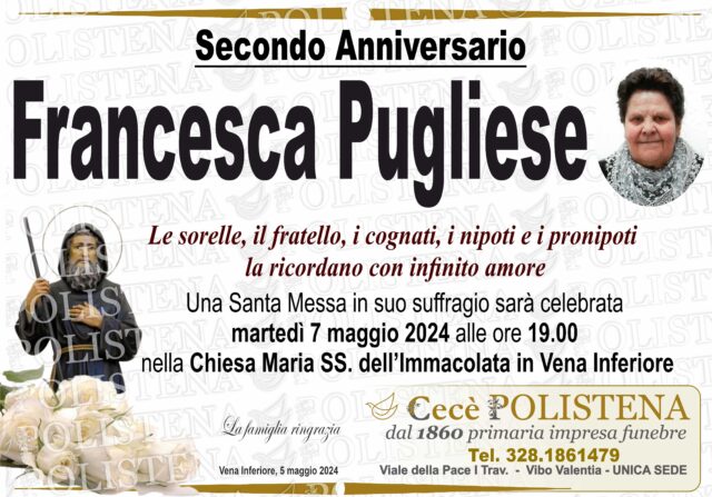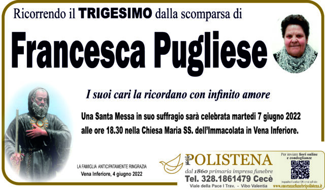 Condividi su Invia condoglianzeNomefrancescaCognomePuglieseData di morte06/05/2022Data funerale08/05/2022Invia condoglianzeTutti i manifesti correlatiNavigazione articoli« PrecedenteTommaso CostaSuccessivo »vincenza Romeo