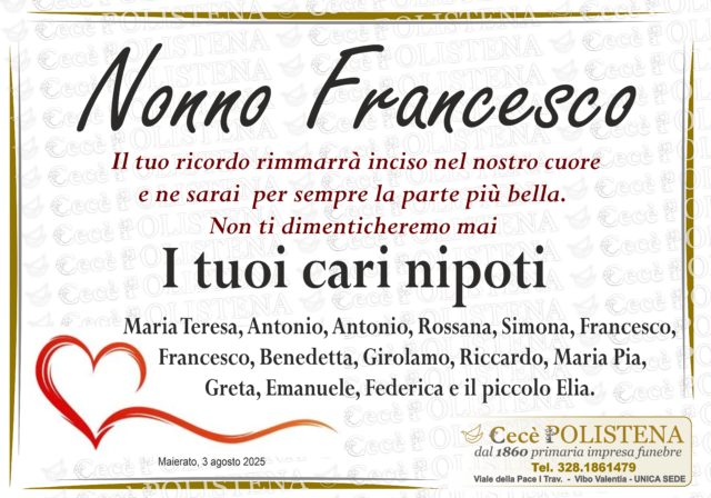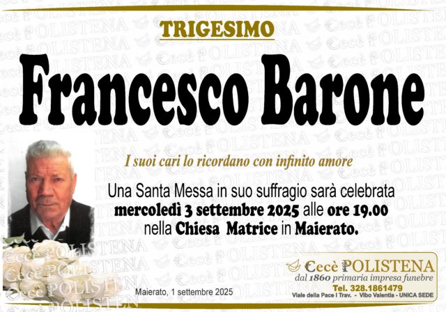 Condividi su Invia condoglianzeNomeFrancescoCognomeBaroneData di morte03/08/2025Data funerale04/08/2025Luogo di sepolturaCimitero di MaieratoInvia condoglianzeTutti i manifesti correlatiNavigazione articoli« PrecedenteGiovan Battista De CariaSuccessivo »Francesco Barreca