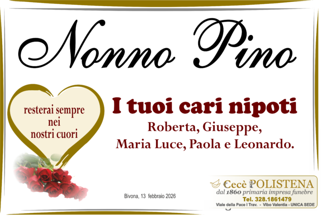 Condividi su Invia condoglianzeNomeGiuseppeCognomeFrancolinoData di morte13/02/2026Data funerale15/02/2026Invia condoglianzeTutti i manifesti correlatiNavigazione articoli« PrecedenteCarmelina FiumaraSuccessivo »Ugo Manduca