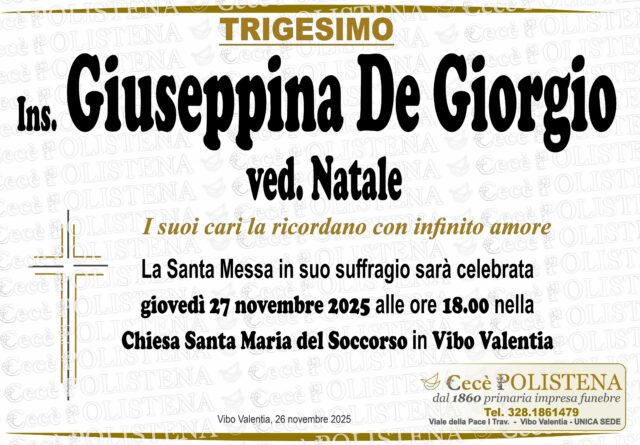 Condividi su Invia condoglianzeNomeGiuseppinaCognomede GiorgioData di morte27/10/2025Data funerale28/10/2025Invia condoglianzeTutti i manifesti correlatiNavigazione articoli« PrecedenteRag. Nicola GaglioneSuccessivo »Rosetta Tropeano