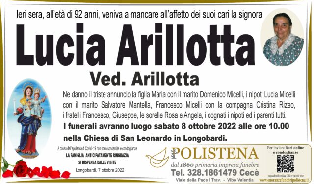 Condividi su Invia condoglianzeNomeLuciaCognomeArillottaData di morte06/10/2022Data funerale07/10/2022Invia condoglianzeTutti i manifesti correlatiNavigazione articoli« PrecedentePaolino RussoSuccessivo »Vittoria Carello
