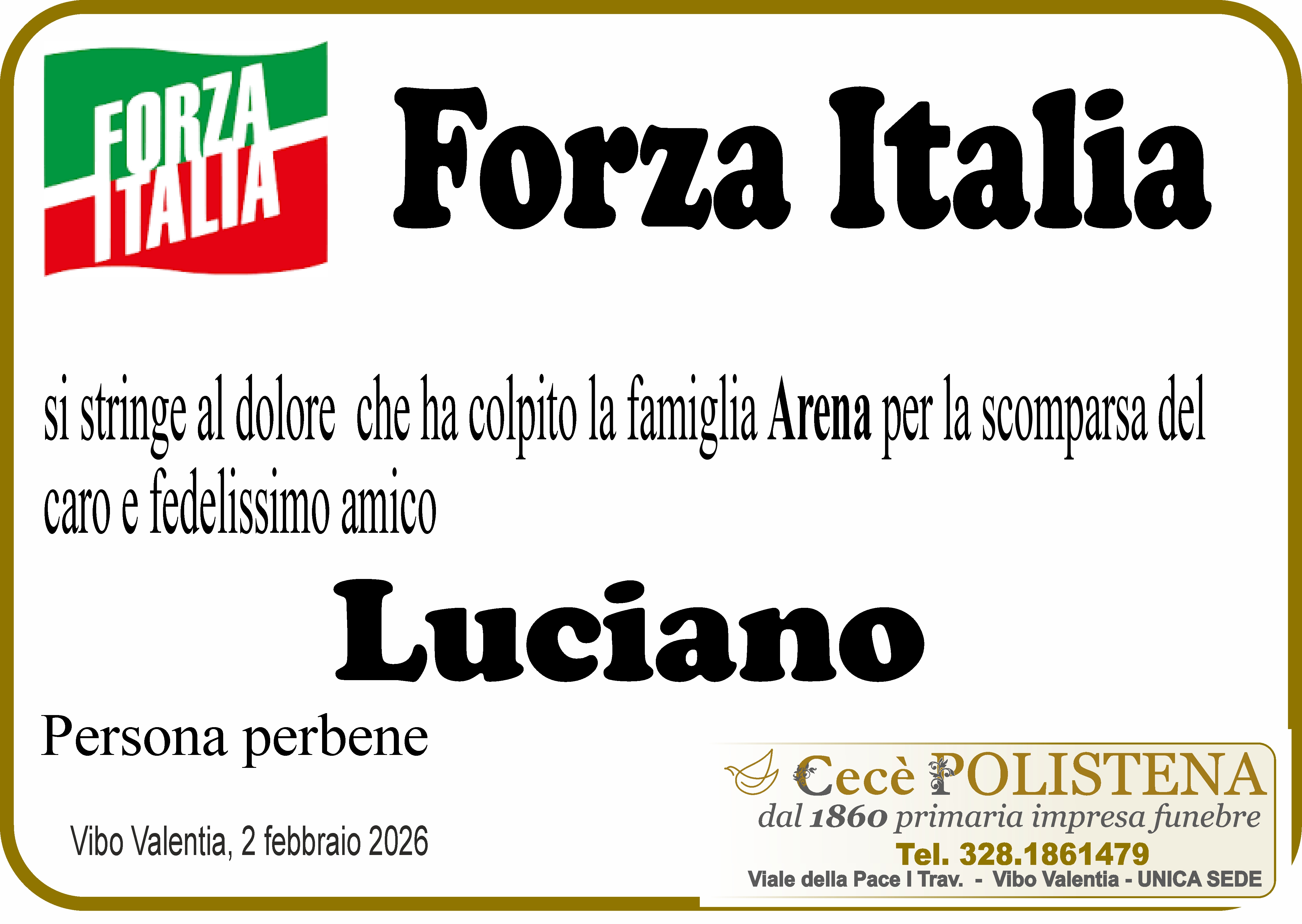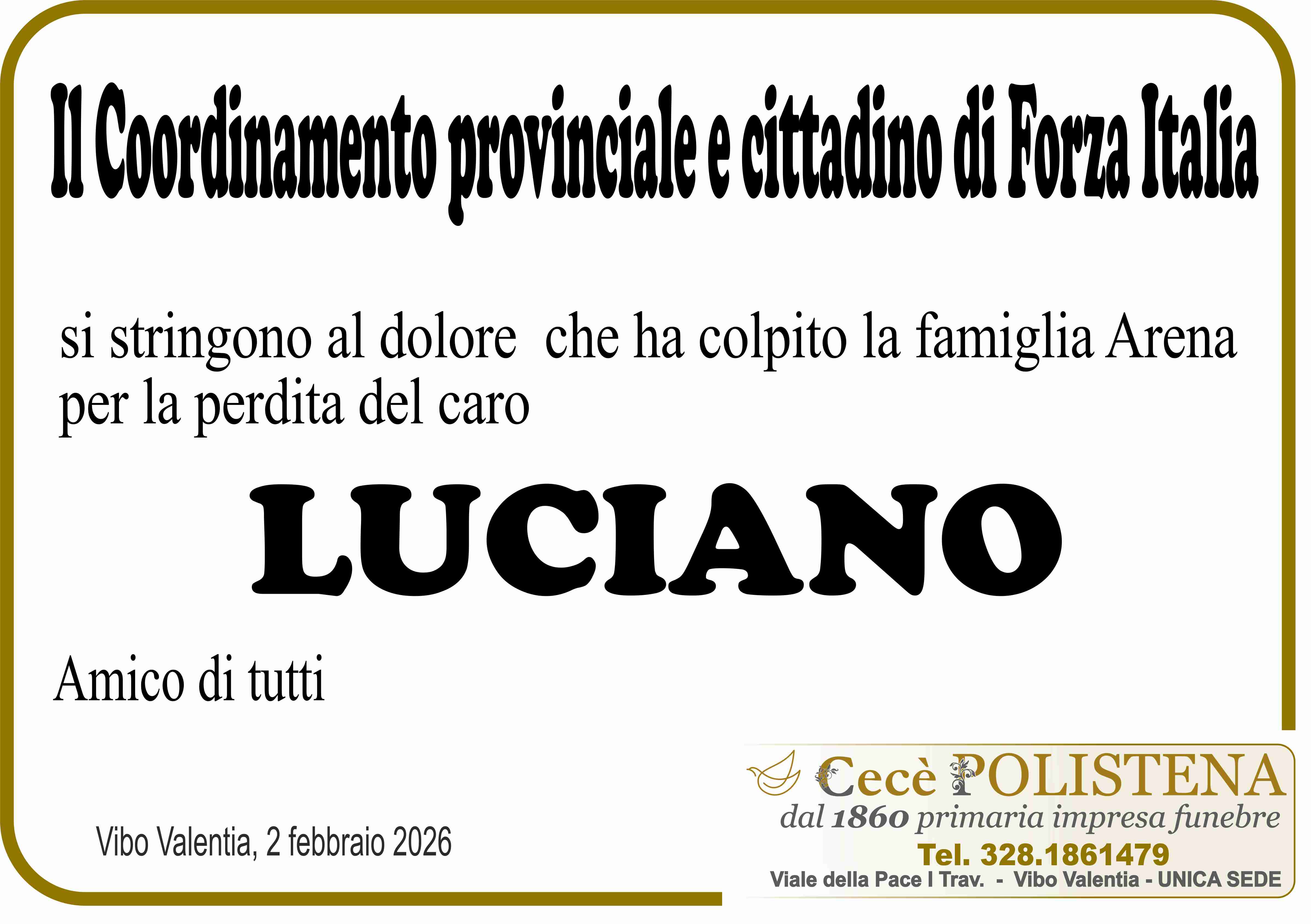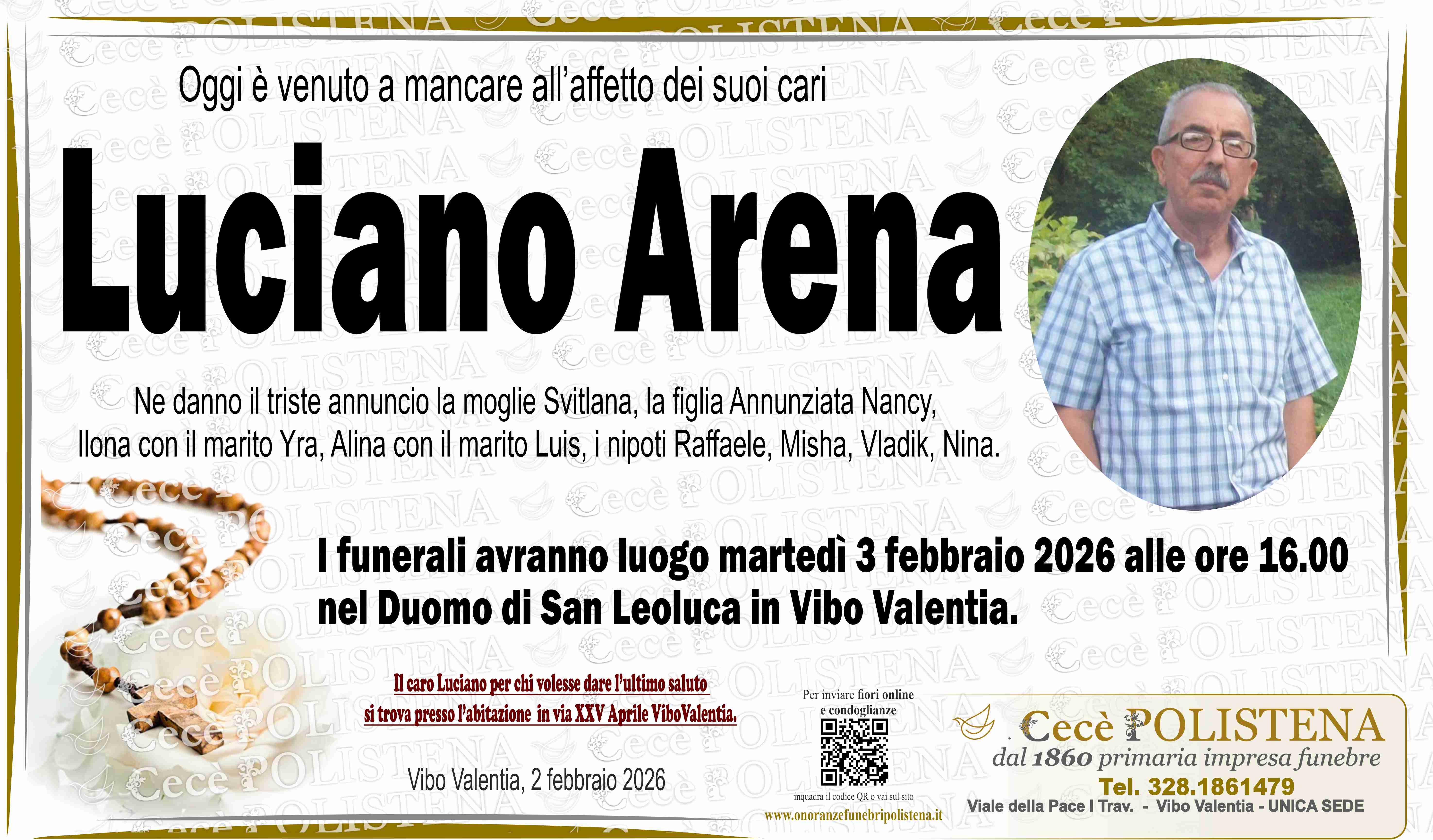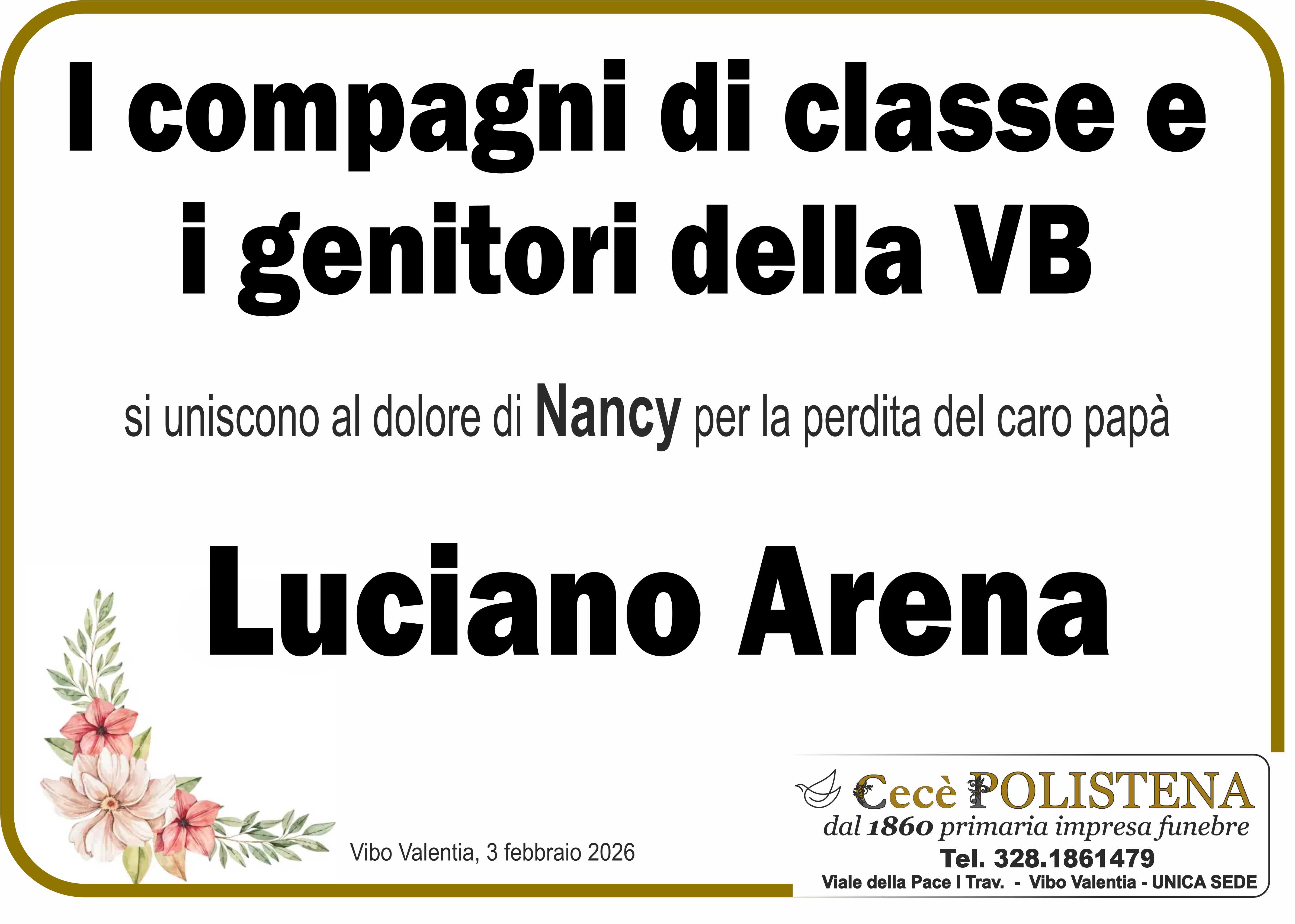 Condividi su Invia fiori Invia condoglianzeNomeLucianoCognomeArenaData di morte02/02/2026Data funerale03/02/2026Invia fiori Invia condoglianzeTutti i manifesti correlatiNavigazione articoli« PrecedenteMaria Soccorsa RizzelloSuccessivo »Maria Lo Bianco