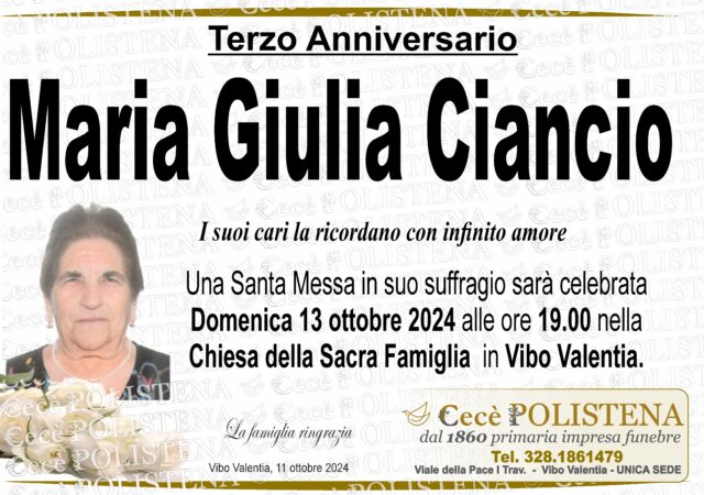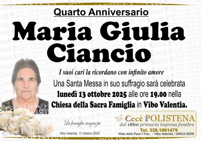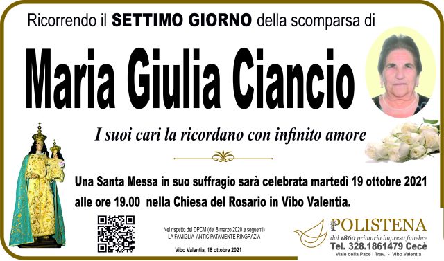 Condividi su Invia condoglianzeNomeMaria GiuliaCognomeCiancioData di morte13/10/2021Data funerale15/10/2021Chiesa funeraleChiesa del Rosario in Vibo ValentiaInvia condoglianzeTutti i manifesti correlatiNavigazione articoli« PrecedenteRosaria La GambaSuccessivo »Nazzareno Lampasi