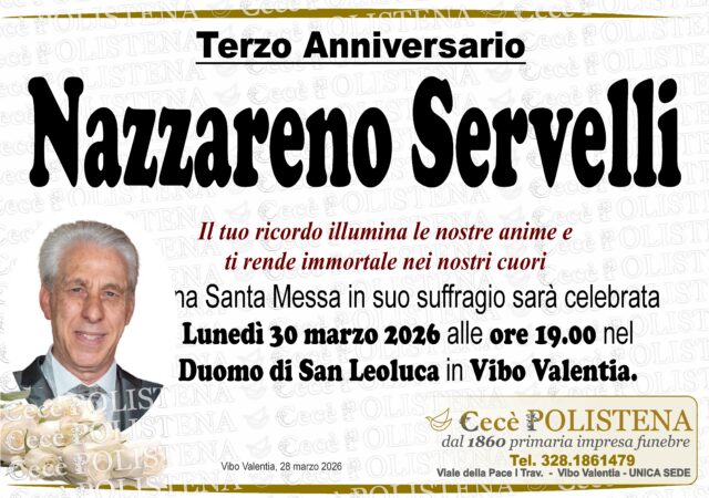 Condividi su NomeNazzarenoCognomeServelliData di morte30/03/2023Data funerale01/04/2023Chiesa funeraleDuomo di San Leoluca in Vibo ValentiaLuogo di sepolturaCimitero Comunale di Vibo ValentiaTutti i manifesti correlatiNavigazione articoli« PrecedenteAntonio Di BrunoSuccessivo »Vincenzo Carnevale