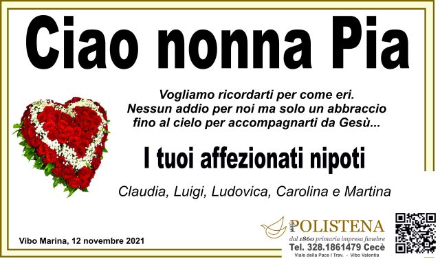 Condividi su Invia condoglianzeNomePiaCognomeBenistatiData di morte12/11/2021Data funerale13/11/2021Chiesa funeraleParrocchia del SS. Rosario in Santa Margherita di BeliceInvia condoglianzeTutti i manifesti correlatiNavigazione articoli« PrecedenteAnna BarbieriSuccessivo »Giuseppe Cirianni