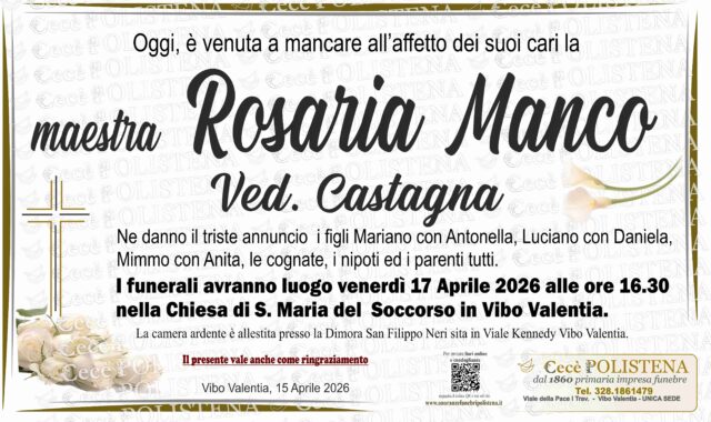 Condividi su Invia fiori Invia condoglianzeNomeRosaria MancoCognomemaestraData di morte15/04/2026Data funerale17/04/2026Chiesa funeraleChiesa di S. Maria del Soccorso in Vibo ValentiaInvia fiori Invia condoglianzeNavigazione articoli« PrecedenteFilippo VitaSuccessivo »Violetta Pizzonia